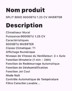 CLIMATISEUR BEKO 9000BTU 1,25CV INVERTER
