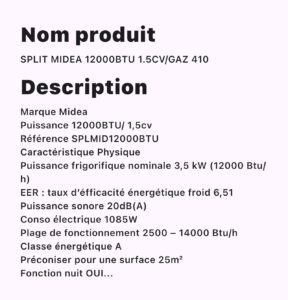 CLIMATISEUR MIDEA 12000BTU 1,5CVV/GAZ 410