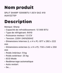 CLIMATISEUR SHARP 12000BTU 1,5CV GAZ 410 AUA12ZTEP