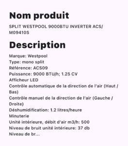 CLIMATISEUR WESTPOOL 9000BTU INVERTER ACS/M0910S