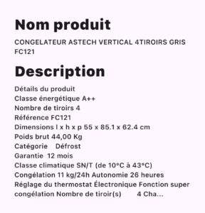 CONGELATEUR ASTECH VERTICAL 4TIROIRS GRIS FC121