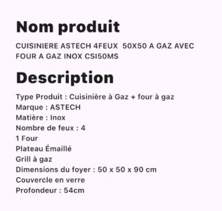 CUISINIER ASTECH 4FEU 50X50 A GAZ AVEC FOUR A GAX INOX CSI50MS