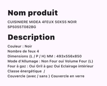 CUISINIERE MIDEA 4FEU 50X55 NOIR SP5055T082BG