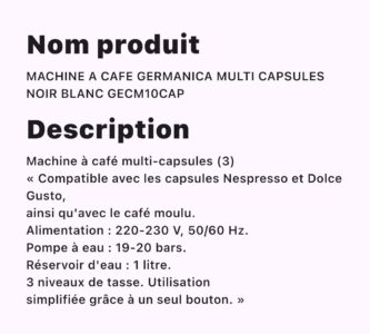 MACHINE A CAFE GERMANICA MULTI CAPSULES NOIR BLANC GECM10CAP