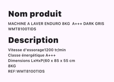 MACHINE A LAVER ENDURO 8SKG A+++ DARK GRIS WMT8100TIDS