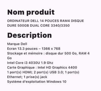 Ordinateur dell 14 pouces RAM 4 disque dure 500gb