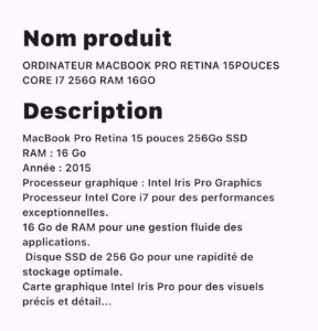 ORDINATEUR MACBOOK PRO RETINA 15POUCES CORE I7 RAM 16GB