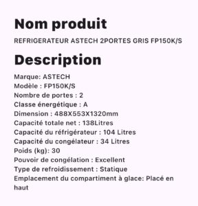 REFRIGERATEUR ASTECH 2PORTES GRIS FP150K/S