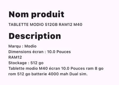 TABLETTE MODIO 512GB RAM 12 M40