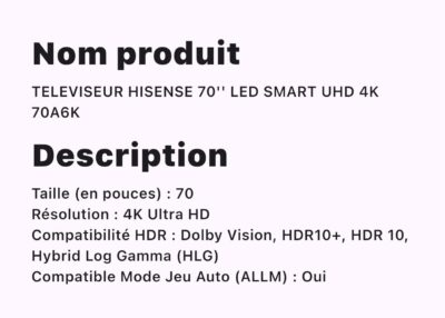 TELEVISEUR HISENSE 70 » LED SMART UHD 4K 70A6K