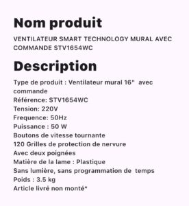 VENTILATEUR SMART TECHNOLOGY MURAL AVEC COMMANDE STV654WC